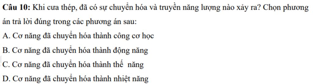 Câu `10`: Khi cưa thép, đã có sự chuyển hóa và truyền năng lượng nào xảy ra? Chọn phương án trả lời đúng trong các phương án sau: