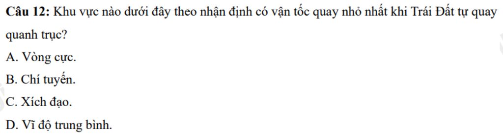 Câu 12: Khu vực nào dưới đây theo nhận định có vận tốc quay nhỏ nhất khi Trái Đất tự quay quanh trục?