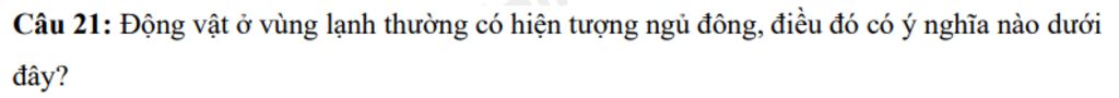 Câu 21: Động vật ở vùng lạnh thường có hiện tượng ngủ đông, điều đó có ý nghĩa nào dưới đây?