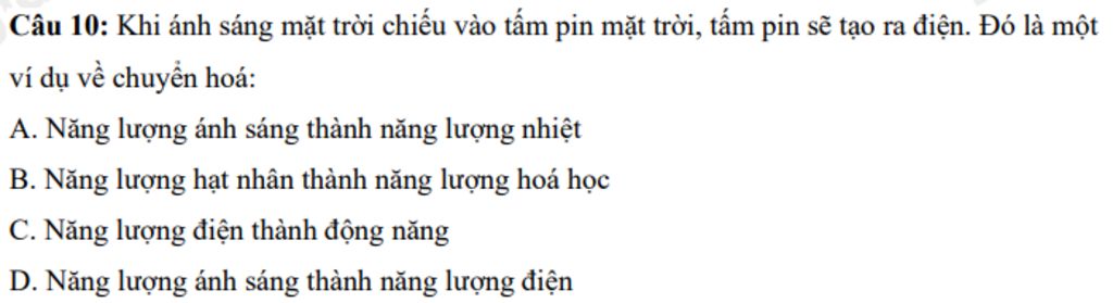 D. Năng lượng ánh sáng thành năng lượng điện