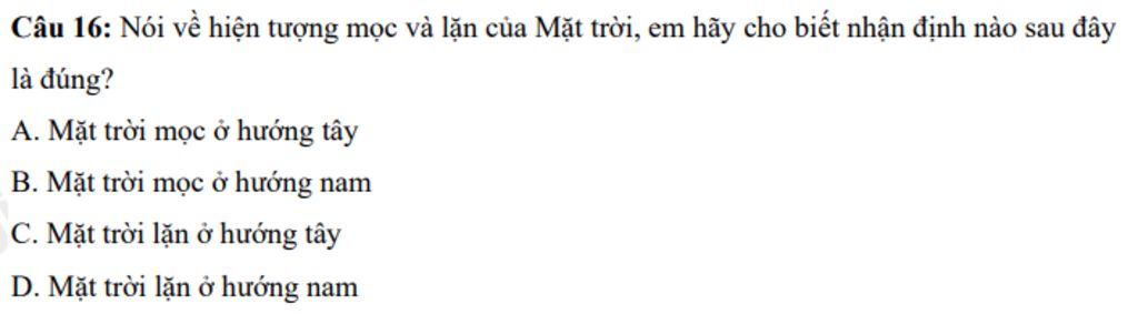 `+D` Mặt Trời lặn ở hướng Nam `sai` vì Mặt Trời lặn hướng Tây