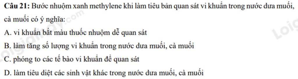 21. Bước nhuộm xanh methylene khi làm tiêu bản quan sát vi khuẩn trong nước dưa muối, cà muối có ý nghĩa: