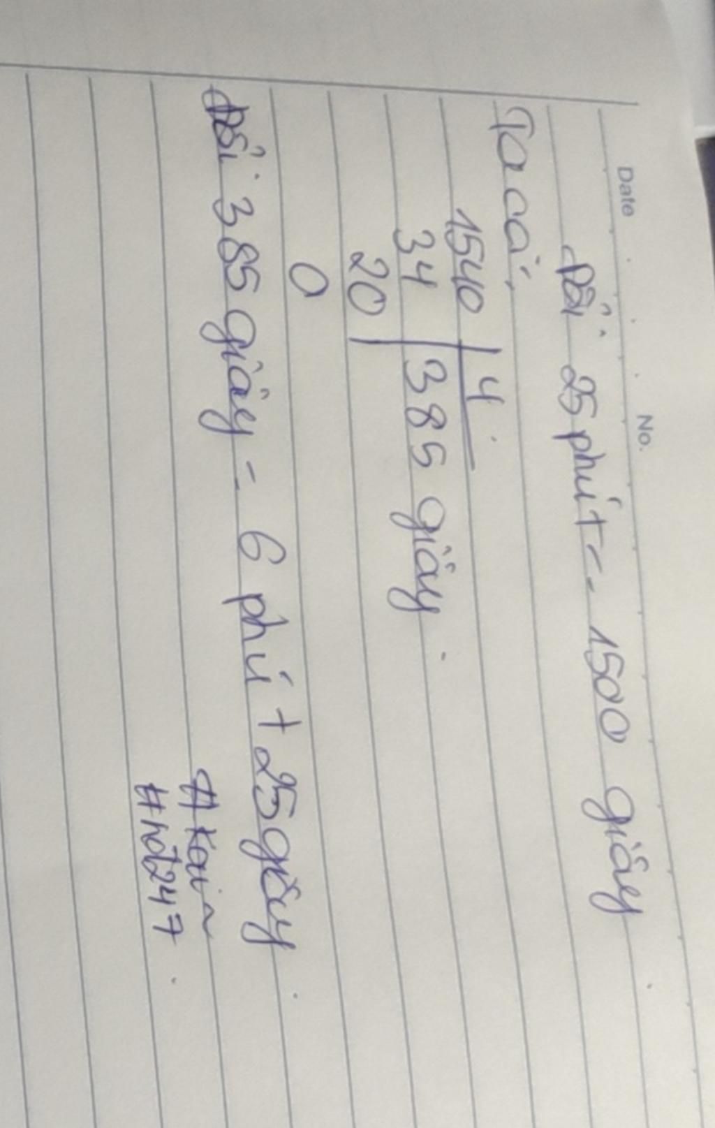 Đặt tính rôi tính: 25 phút 40 giây : 4