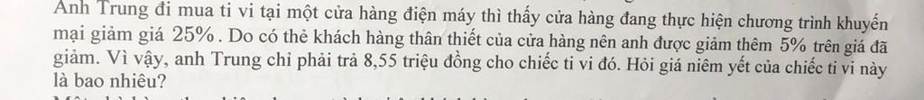 Số tiền anh Trung phải trả cho chiếc TV đó khi có thẻ khách hàng thân thiết và được giảm `5%` trên giá đã giảm là: