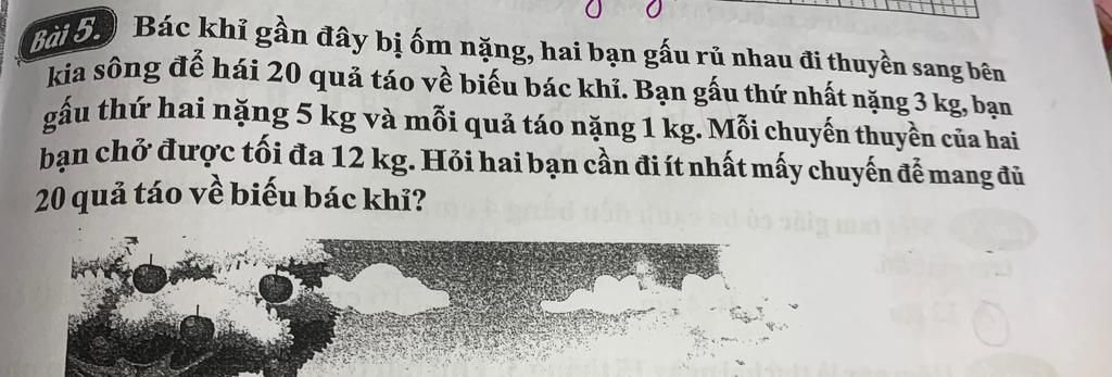 `2` bạn cần ít nhất số chuyến để mang đủ hết `20` quả táo là :