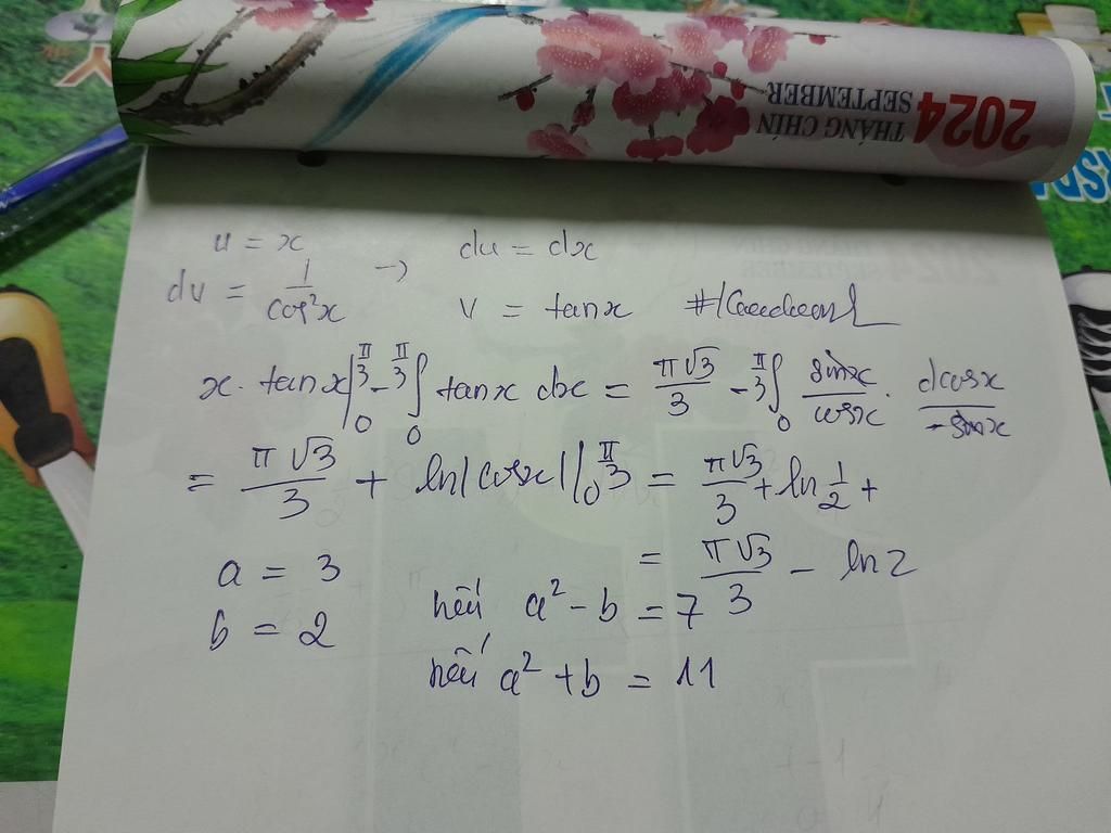 Biết `I=` $\int\limits^{\frac{\pi}3}_0 {\dfrac{x}{cox^2x}} \, dx$ `={sqrt3}/a pi-lnb`. Khi đó giá trị của `a^2=b` bằng