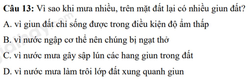 `-`Giun đất hô hấp qua da nên khi môi trường xung quanh ngập nước nó không thể thực hiện hô hấp. Phải ngoi lên mặt đất để tìm kiếm không khí và `O_2`