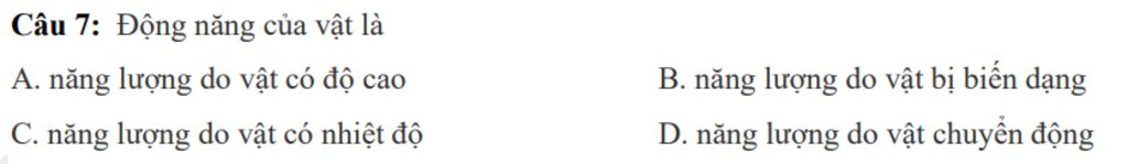 A. năng lượng do vật có độ cao B. năng lượng do vật bị biến dạng