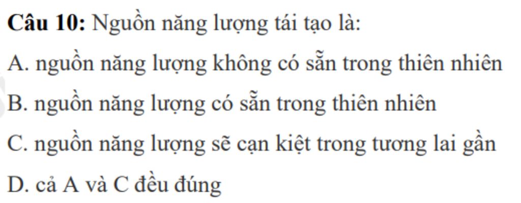 ⇒ Nguồn năng lượng tái tạo là nguồn năng lượng có sẵn trong thiên nhiên vì chúng được tạo ra từ các nguồn tài nguyên tự nhiên như ánh nắng, gió, nước, nhiệt,..... Đây là các nguồn năng lượng không bao giờ cạn kiệt và có thể tái tạo lại theo thời gian.