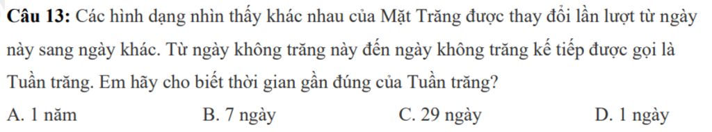 `@` Từ ngày không trăng này đến ngày không trăng kế tiếp được gọi là Tuần trăng. Thời gian gần đúng của Tuần trăng là `29` ngày.