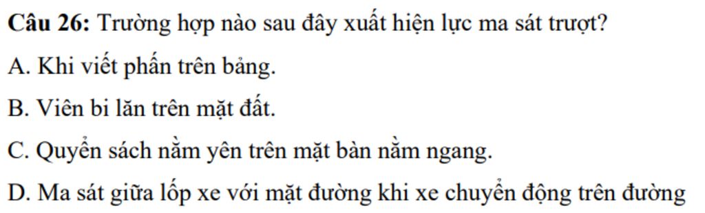 Câu 26: Trường hợp nào sau đây xuất hiện lực ma sát trượt?