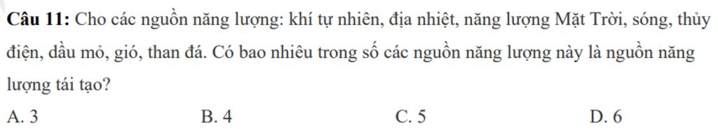Câu `11`: Cho các nguồn năng lượng: khí tự nhiên, địa nhiệt, năng lượng Mặt Trời, sóng, thủy điện, dầu mỏ, gió, than đá. Có bao nhiêu trong số các nguồn năng lượng này là nguồn năng lượng tái tạo?