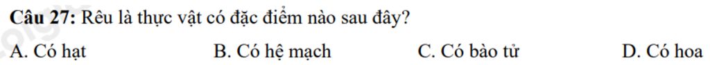 `@`Rêu là thực vật có đặc điểm là: không có mạch dẫn, sinh sản bằng bào tử, không có hoa và hạt