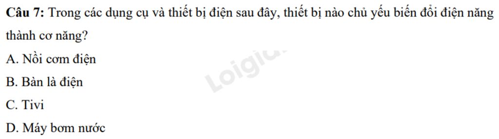 `-` Trong các dụng cụ và thiết bị điện sau đây, thiết bị máy bơm nước chủ yếu biến đổi điện năng thành cơ năng làm quay động cơ và cánh quạt.