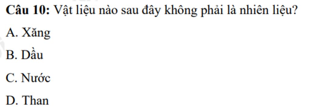 `@`Nước không phải là nhiên liệu vì nó không cháy như xăng, dầu và than. Nước thường được sử dụng làm dung môi, chất làm mát