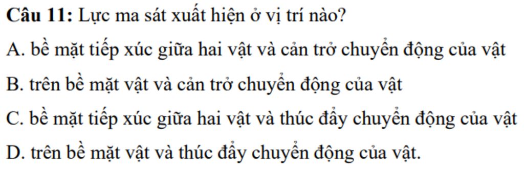`@` Lực ma sát xuất hiện ở bề mặt tiếp xúc của `2` vật và cản trở chuyển động.