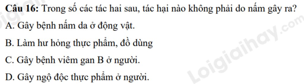 Câu 16: Trong số các tác hai sau, tác hại nào không phải do nấm gây ra?