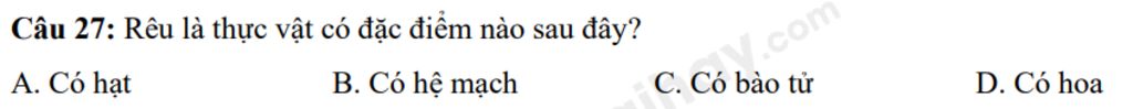Câu 27: Rêu là thực vật có đặc điểm nào sau đây?