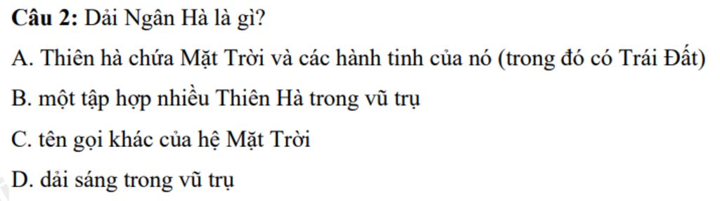 `-` Dải ngân hà là thiên hà chứa Mặt Trời và các hành tinh của nó (trong đó có Trái Đất, các hòn đã, các hành tinh,...)