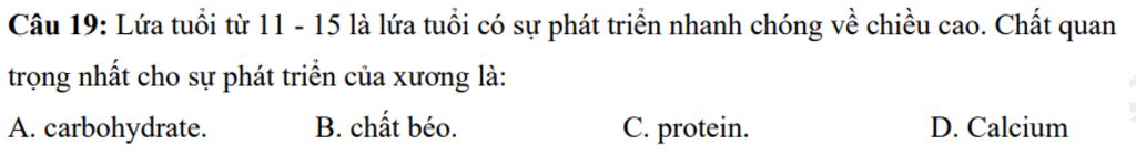 `-` Lứa tuổi từ 11 - 15 là lứa tuổi có sự phát triển nhanh chóng về chiều cao. Chất quan trọng nhất cho sự phát triển của xương là Calcium