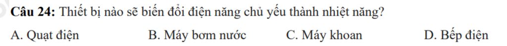 Câu `24:` Thiết bị nào sẽ biến đổi điện năng chủ yếu thành nhiệt năng?