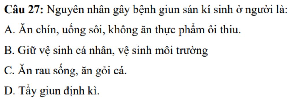 Câu 27: Nguyên nhân gây bệnh giun sán kí sinh ở người là: