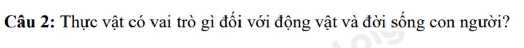 `+` Trong đời sống, thực vật có vai trò như làm lượng thực, thực phẩm cho con người, làm cảnh, làm thuốc,...