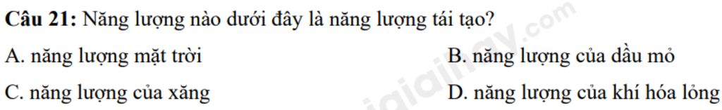 Câu 21: Năng lượng nào dưới đây là năng lượng tái tạo?