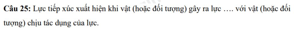 Câu 25: Lực tiếp xúc xuất hiện khi vật (hoặc đối tượng) gây ra lực …. với vật (hoặc đối tượng) chịu tác dụng của lực.
