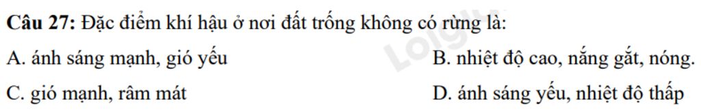 `@` Đặc điểm khí hậu ở nơi đất trống không có rừng là nhiệt độ cao, nắng gắt, nóng. Vì rừng giúp cho không khí mát mẻ, có bóng râm nên không không có rừng thì nhiệt độ cao, nắng gắt, nóng.