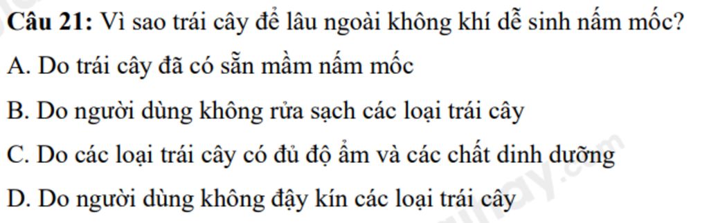 `@` Trái cây để lâu bên ngoài không khí dễ bị mốc vì bên trong trái cây đã có đủ độ ẩm và dinh dưỡng cho nấm phát triển. Đối với nấm, trái cây là một vật chủ thích hợp để có thể phát triển trên đó vì nó có đủ điều kiện để nấm có thể phát triển.