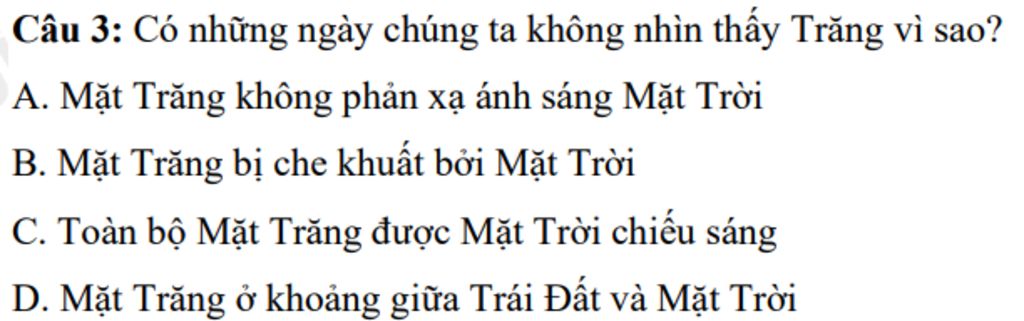 Giải thích: Trăng được phát sáng nhờ vào ánh sáng của Mặt Trời chiếu vào và Mặt Trăng sẽ hắt lại ánh sáng đó giúp chúng ta thấy được Trăng. Nếu Mặt Trang không phản xạ ánh sáng Mặt Trời thì ta không thể thấy Trăng