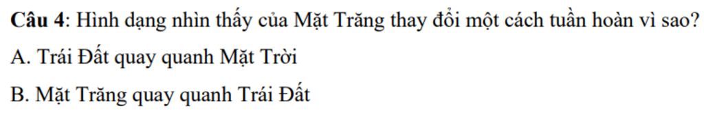 Câu 4: Hình dạng nhìn thấy của Mặt Trăng thay đổi một cách tuần hoàn vì sao?