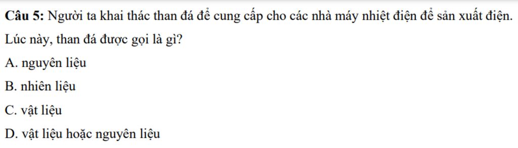 Giải thích các bước giải: Khi khai thác than đá để cung cấp cho các nhà máy nhiệt điện để sản xuất điện, than đá lúc này là chất đốt, cung cấp điện nên gọi là nhiên liệu