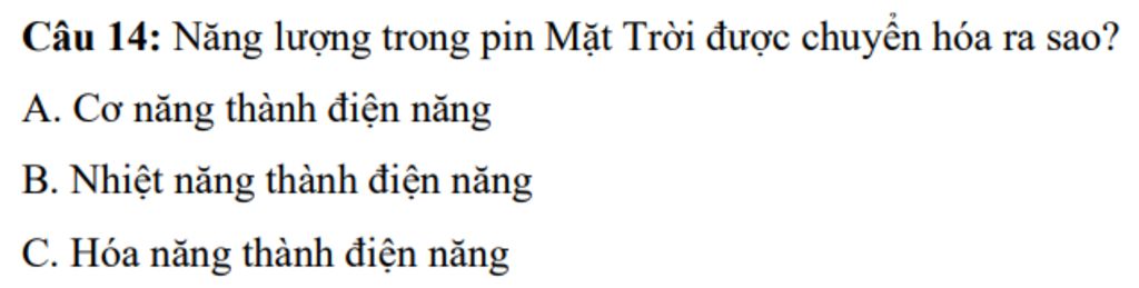 `@`Năng lượng trong pin Mặt Trời được chuyển hóa từ quang năng thành điện năng vì pin Mặt Trời sẽ hấp thụ ánh nắng (quang năng) để chuyển thành điện năng