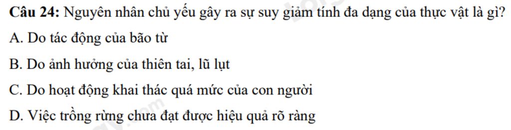 `@`Nguyên nhân chủ yếu gây giảm tính đa dạng của thực vật do sự khai thác quá mức để phục vụ đời sống của con người