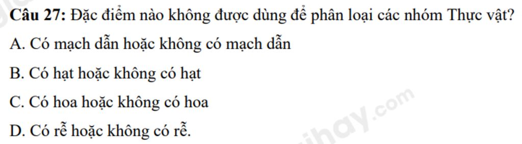 Câu 27: Đặc điểm nào không được dùng để phân loại các nhóm Thực vật?