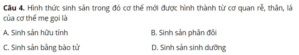 `-` Giải thích : Vì sinh sản sinh dưỡng là một hình thức sinh sản vô tính ở thực vật trong đó một cây mới phát triển từ cơ quan sinh dưỡng của cây mẹ hoặc các cấu trúc sinh sản chuyên biệt gọi là chồi mầm sinh dưỡng