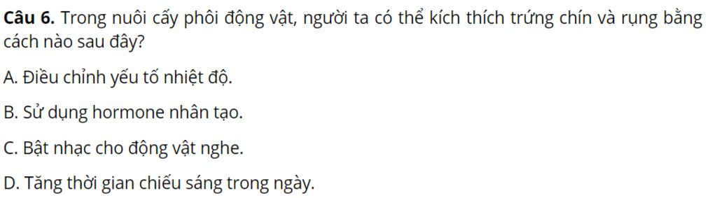 `@`Để kích thích trứng chín và rụng trong nuôi cấy phôi động vật, phương pháp phổ biến nhất là sử dụng hormone nhân tạo