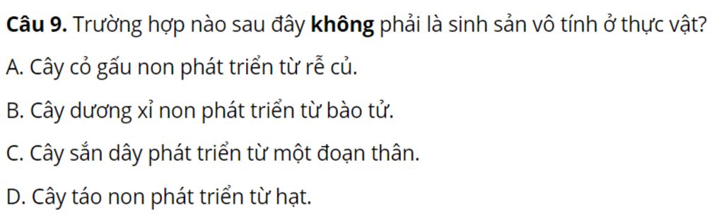 `D.` Hạt được tạo ra do sự kết hợp của giao tử đực và giao tử cái `→` Cây táo non phát triển từ hạt là hình thức sinh sản hữu tính.