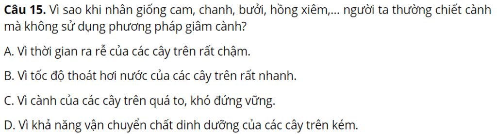 `-` Giải thích : Vì thời gian ra rễ của các cây trên rất chậm nên khi nhân giống cam, chanh, bưởi, hồng xiêm,... người ta thường chiết cành mà không sử dụng phương pháp giâm cành