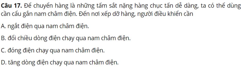`-` Giải thích : Vì để chuyển hàng là những tấm sắt nặng hàng chục tấn dễ dàng, ta có thể dùng cần cẩu gắn nam châm điện. Đến nơi xếp dỡ hàng, người điều khiển cần ngắt điện qua nam châm điện.