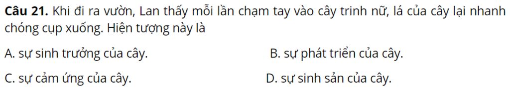 `-` Giải thích : Vì hiện tượng lá cây trinh nữ cụp lại khi có tay ta chạm vào là phản ứng của cây trước tác nhân kích thích của môi trường là hiện tượng cảm ứng của cây.