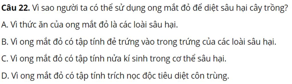 Câu `22.` Vì sao người ta có thể sử dụng ong mắt đỏ để diệt sâu hại cây trồng `?`