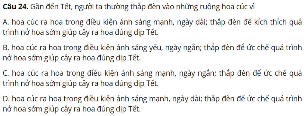 `C.` hoa cúc ra hoa trong điều kiện ánh sáng mạnh, ngày ngắn; thắp đèn để ức chế quá trình nở hoa sớm giúp cây ra hoa đúng dịp Tết.