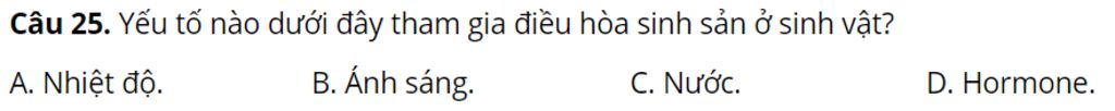 `@` Hormone là yếu tố tham gia điều hòa sinh sản ở sinh vật.
