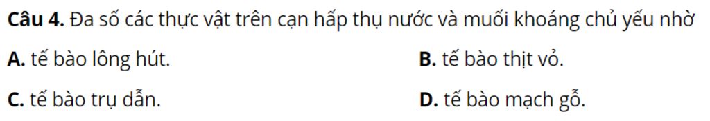 Câu `4.` Đa số các thực vật trên cạn hấp thụ nước và muối khoáng chủ yếu nhờ