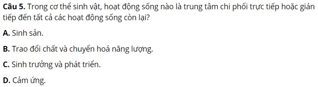 - Trong cơ thể sinh vật, hoạt động sống nào là trung tâm chi phối trực tiếp hoặc gián tiếp đến tất cả các hoạt động sống còn lại. Nhờ trao đổi chất và chuyển hóa năng lượng, con người có thể sinh trưởng trưởng, phát triển, cảm ứng và sinh sản.