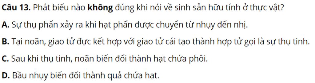 Câu `13`. Phát biểu nào không đúng khi nói về sinh sản hữu tính ở thực vật?