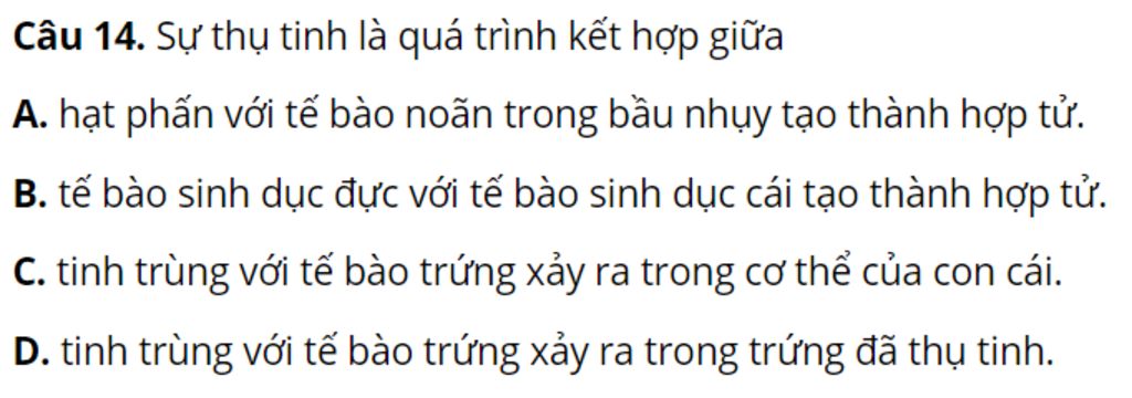 Câu `14`. Sự thụ tinh là quá trình kết hợp giữa